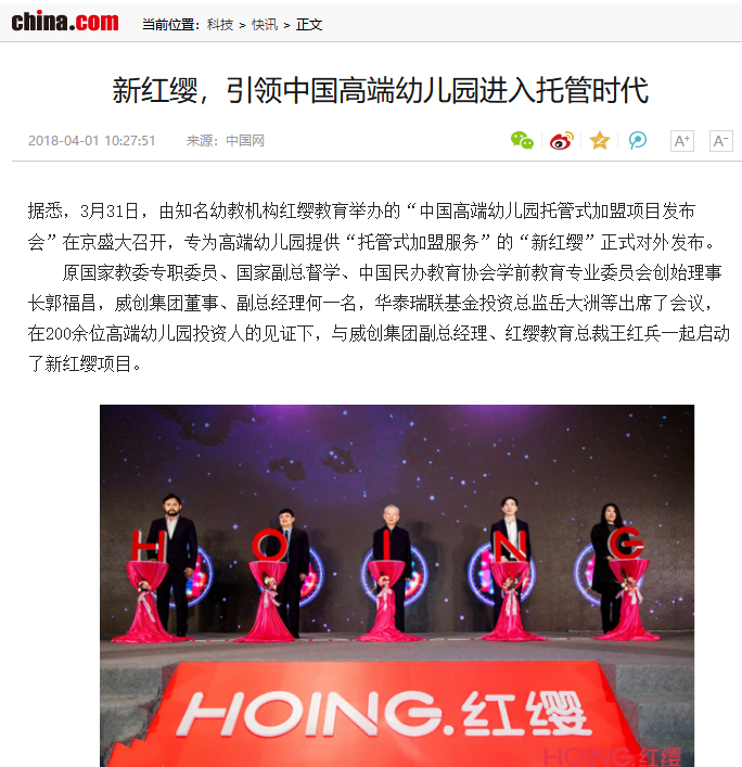 據悉,3月31日,由知名幼教機構紅纓教育舉辦(bàn)的“中國高端幼兒園托管式加盟項目發布會”在京盛大召開,專爲高端幼兒園提供“托管式加盟服務”的“新紅纓”正式對(duì)外發布。
