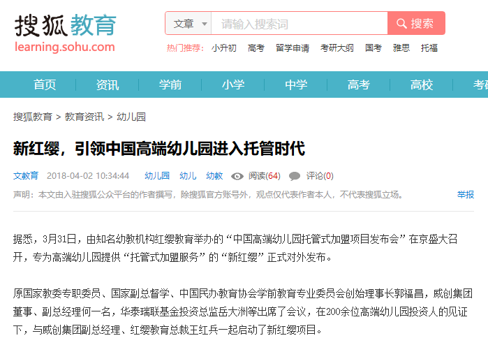 新紅纓,立志做高端幼兒園托管專家,期待其以實際行動帶(dài)領中國高端園市場(chǎng)走向完善與成熟。