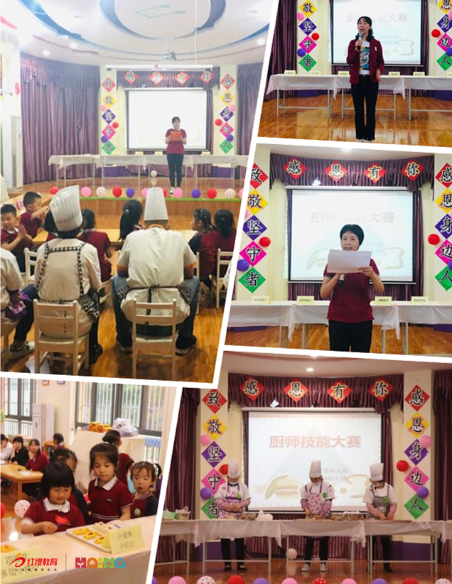 本次大賽有六名廚師參(cān)賽,由風趣幽默、童心滿滿的徐格娟老師主持,特邀金桔幼教集團馮董事長和許總監光臨指導,並(bìng)安排9名小朋友代表參(cān)加、7名老師擔任評委。