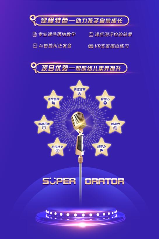 《演說之星》就是這朵火花,它就是紅纓教育集結母公司威創兒童成長(zhǎng)平台的頂尖教研團隊、《超級演說家》演講培訓專家,針對幼兒低齡化的特點,開發出的一套以線下園所優秀教師引導、線上超演名師示範、AI人工智能導師在線糾音於(yú)一體的三師課程模式的幼兒演說課程。